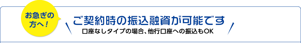 口座なしタイプ契約時の振込融資を希望の方は、ご契約書類の所定の欄に振込先口座と振込希望額をご記入ください。(「WEB完結」の方は、正式ご契約時にご入力ください。)ローンカード到着前にご指定の口座に融資金を振込します。お急ぎの場合は、当行ホームページよりご契約書類をダウンロード・印刷し、FAXで当行へ送付ください。